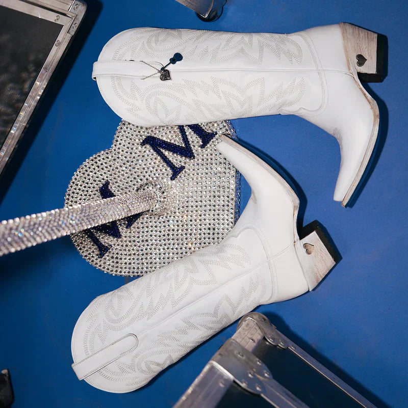 Step into the limelight with these chic cowgirl boots. Embrace the modern cowgirl vibe with the versatile white design that effortlessly pairs with any outfit. The distinctive heart heel detail elevates your look with a touch of sophistication.
